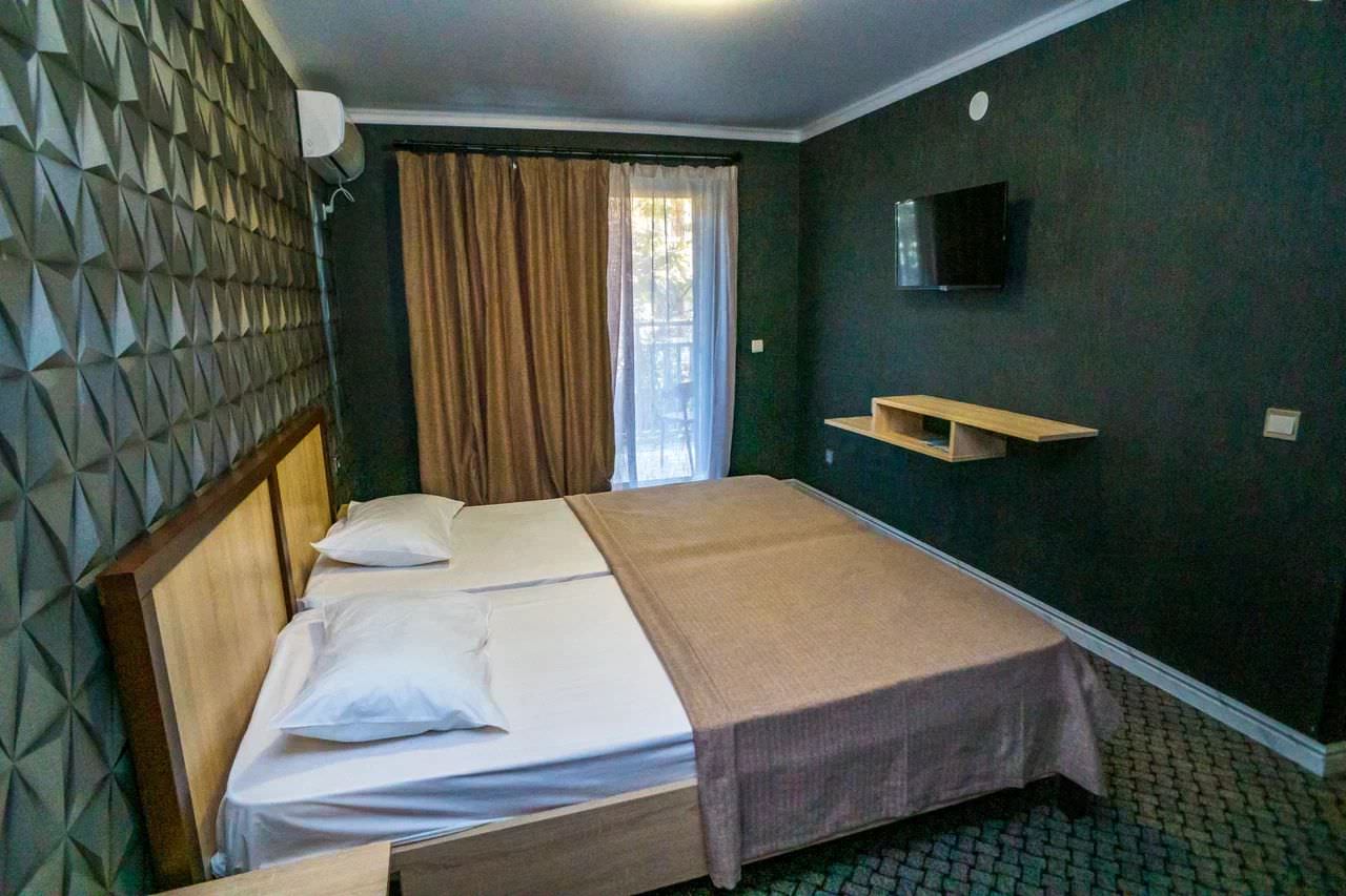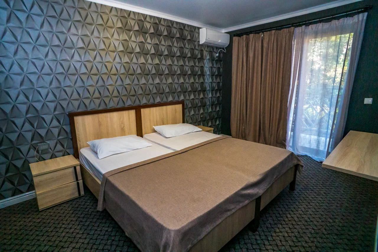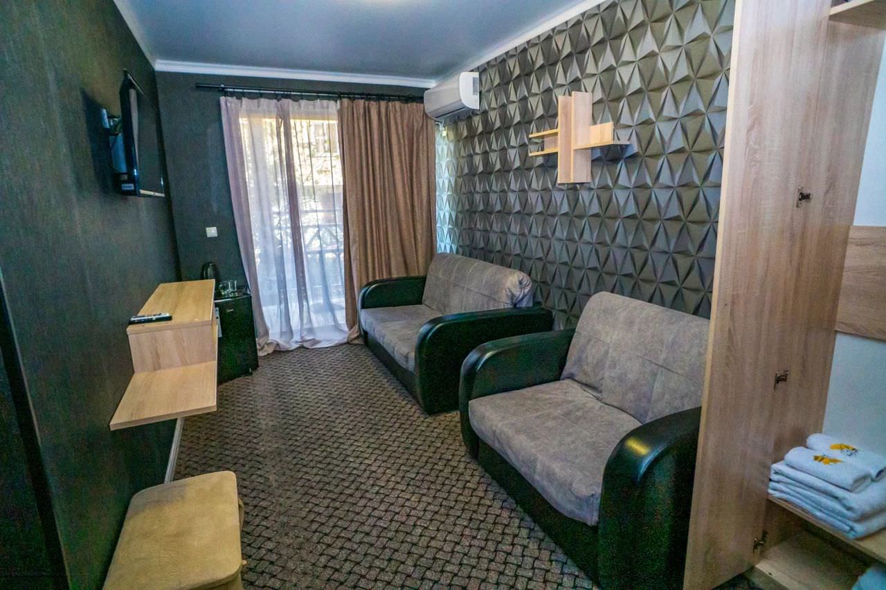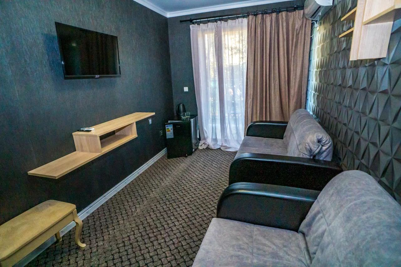 2-х местный 2-х комнатный номер «Полулюкс» корпус №2Площадь номера: 36 м2Номер оснащен: 1 двуспальная кровать, мягкая мебель, телевизор, кондиционер, холодильник, 2 балкона.Санузел: душ, раковина, туалет.Максимальная вместимость- 4 чел.